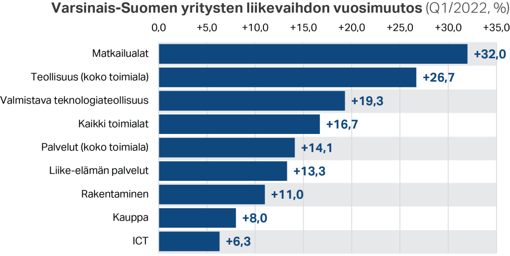 Koronapandemian alku lähes kaksi vuotta sitten teki merkittävän loven Varsinais-Suomen yritysten liikevaihtoon. Koronakriisistä elpyminen oli kuitenkin vahvassa vauhdissa kevättalvella 2022. Varsinais-Suomen yritysten liikevaihto kasvoi vuoden ensimmäisellä neljänneksellä 16,1 % vuodentakaiseen verrattuna, ja kasvua nähtiin kaikilla seurannassa olevilla aloilla.