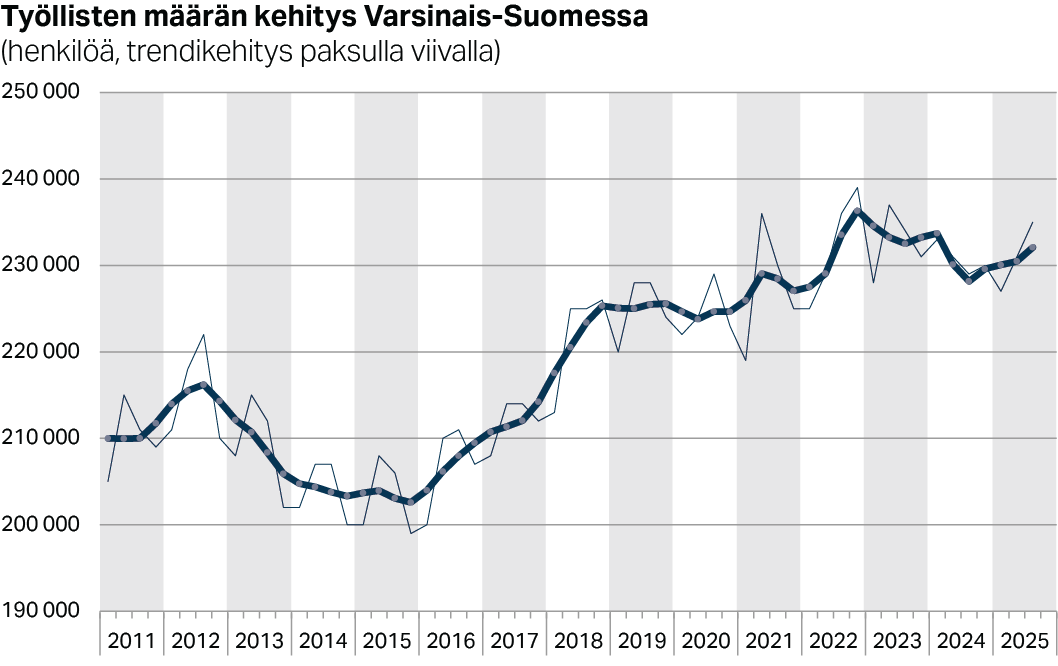 Työllisyysasteeseen vaikuttaa työllisten määrän lisäksi työikäisen väestön määrä, joka on kasvanut viime aikoina paljon etenkin Uudellamaalla, mutta myös Varsinais-Suomessa ja Pirkanmaalla. Varsinais-Suomessa työllisten määrän trendikehitys onkin kasvanut jo koko kuluvan vuoden ajan, ja työllisisä oli vuoden kolmannella neljänneksellä noin tuhat enemmän kuin vuotta aiemmin.