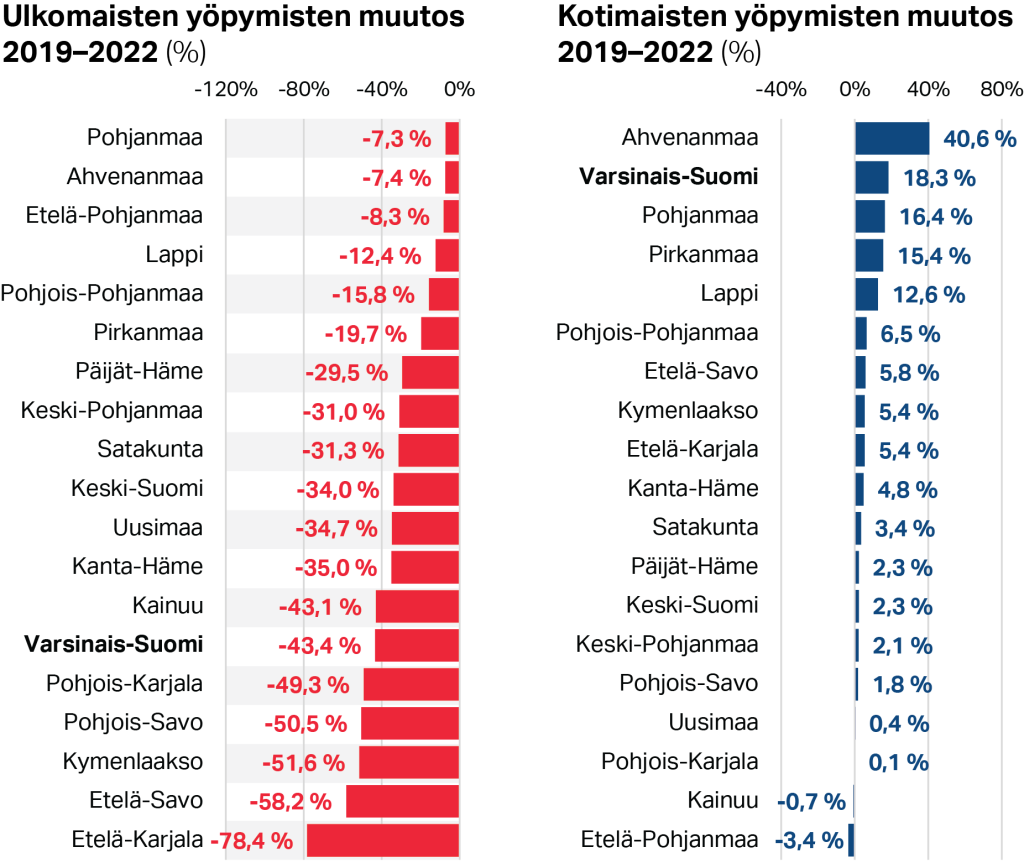 Ulkomailta tulevien matkailijoiden määrä sen sijaan jäi matkustusrajoitusten vuoksi pandemian aikana ymmärrettävästi hyvin alhaiselle tasolle. Kuitenkin myös kesällä 2022 ulkomaiset yöpymiset olivat selvästi koronaa edeltävää tilannetta alemmalla tasolla, ja ulkomaisten matkailijoiden virrat Varsinais-Suomeen jäivät viime vuonna lähes 50 % vuoteen 2019 verrattuna.