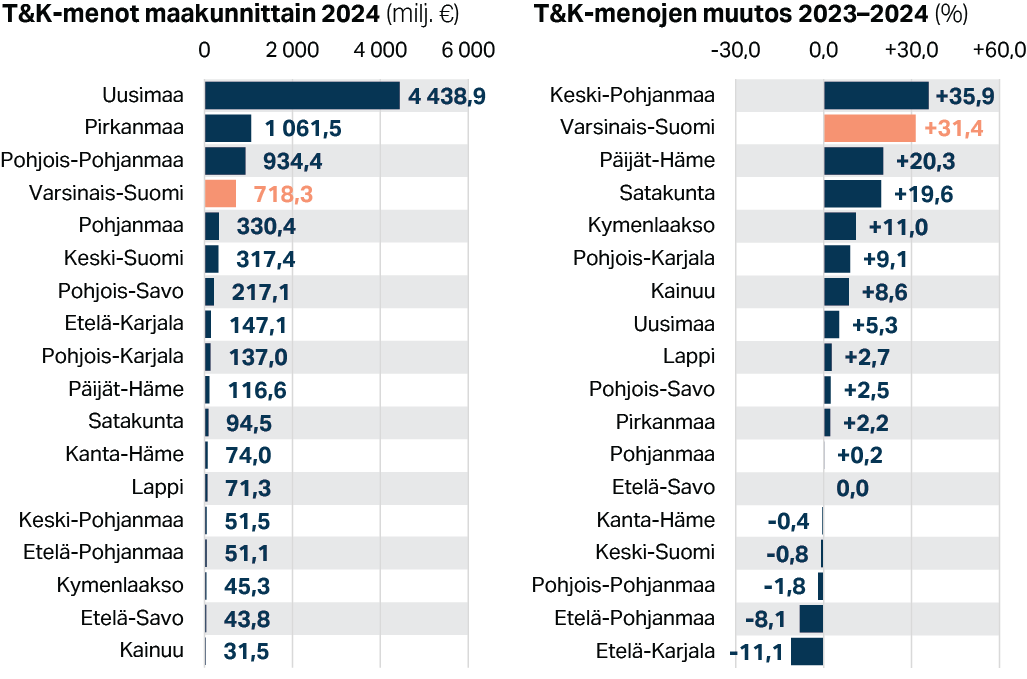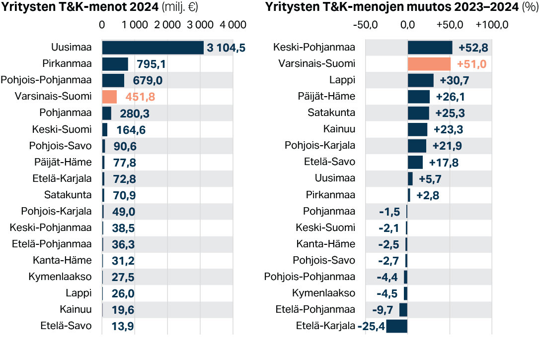 T&K-menojen kasvu johtui ennen kaikkea yritysten lisääntyneistä panostuksista tutkimukseen ja kehittämiseen. Yritysten T&K-menot olivat vuonna 2024 puolet suuremmat kuin edellisenä vuotena. Euromääräisesti yritysten panostukset kasvoivat 153 miljoonaa euroa, kun Pirkanmaalla vastaava kasvu oli vain 21 miljoonaa. Pohjois-Pohjanmaalla yritysten T&K-menot puolestaan vähenivät 31 miljoonaa euroa. Varsinais-Suomi kiri siis merkittävästi kiinni Pirkanmaan ja Pohjois-Pohjanmaan etumatkaa yritysten T&K-menoissa.